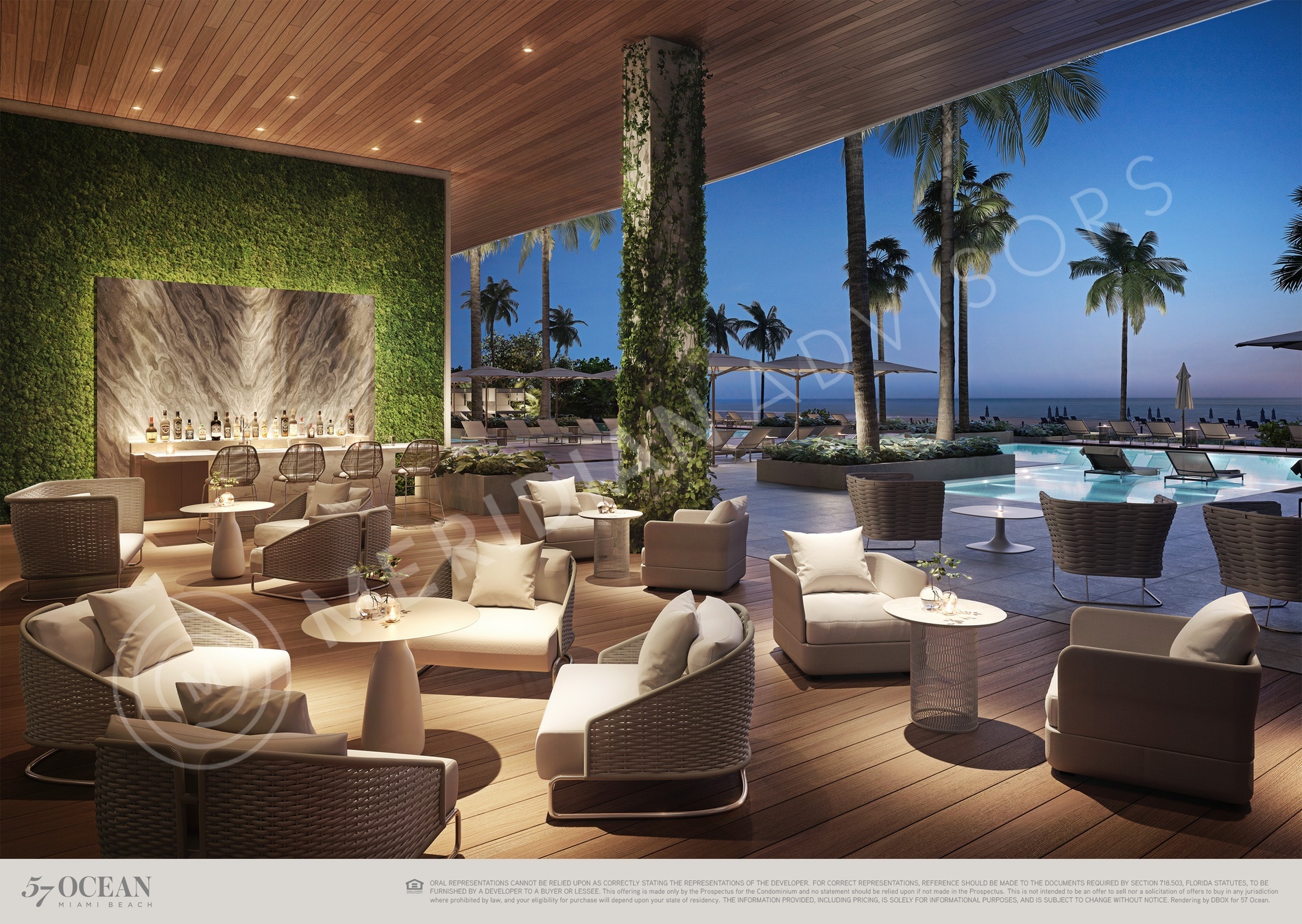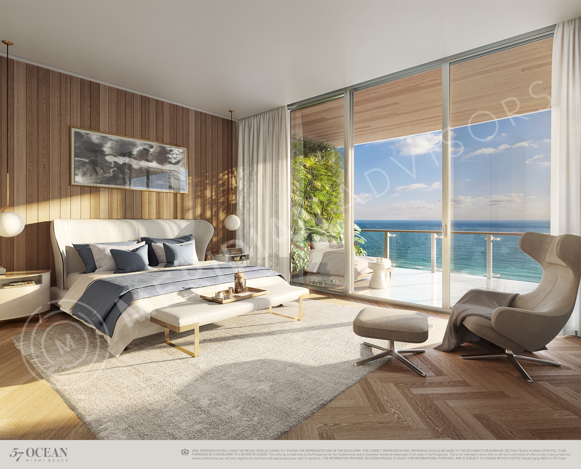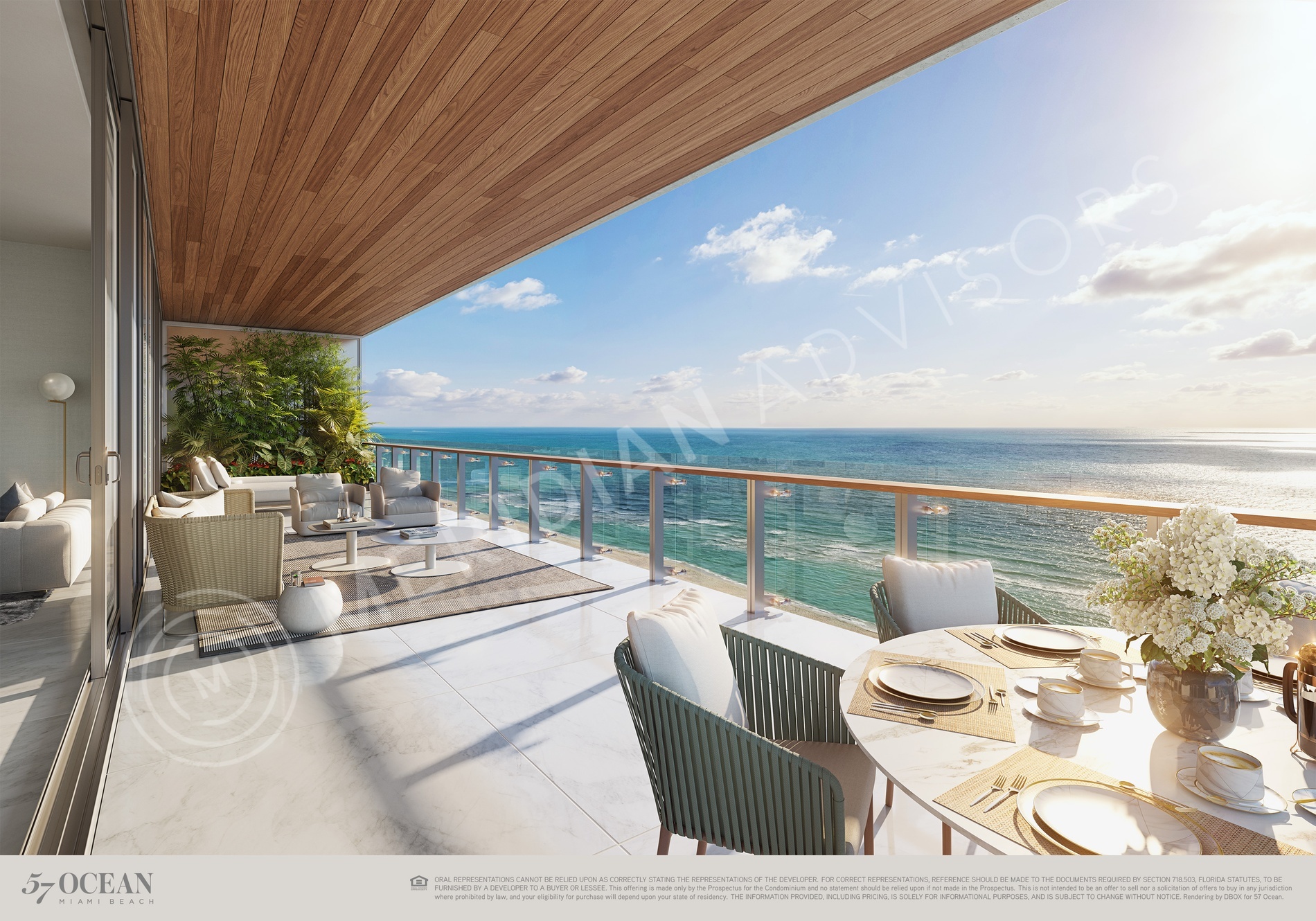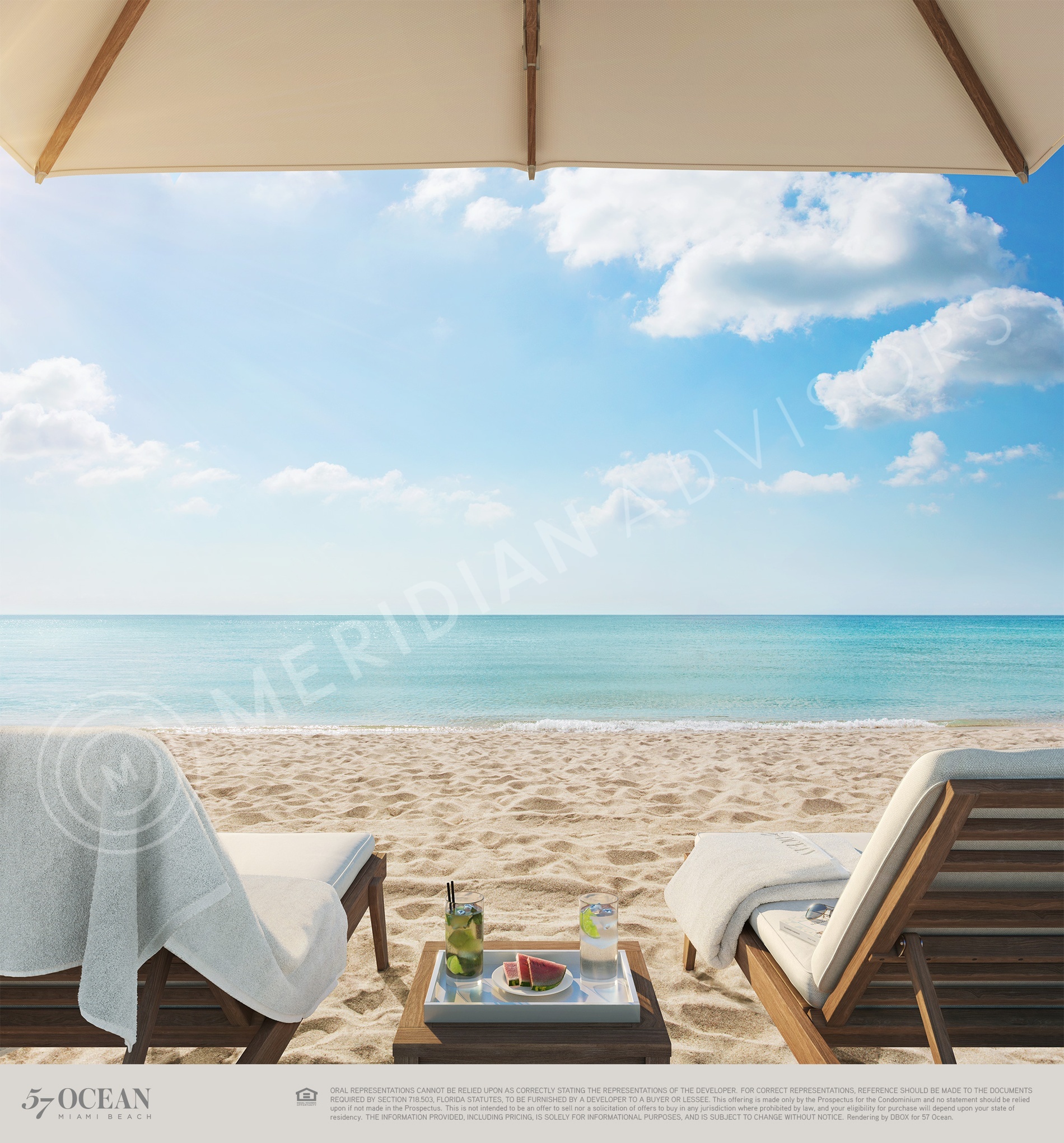 From the moment you step inside 57 Ocean, you’ll be greeted by a grand flow-through lobby with natural stone sun-drenched by the oceanfront vistas. Each residence within this community comes with excellently appointed upgrades, such as solid Carrara marble countertops, sumptuous primary suites featuring Poliform bathrooms, 10-foot floor-to-ceiling impact glass stacking doors, and tropical modern-inspired interior design. To take full advantage of Miami Beach’s alfresco lifestyle, all units are crowned with 12-foot deep terraces apropos, which spotlight wood-like ceiling accents and unrivaled waterfront panoramas. An outdoor living room adjacent to the sands of Miami Beach? Yes, please!
