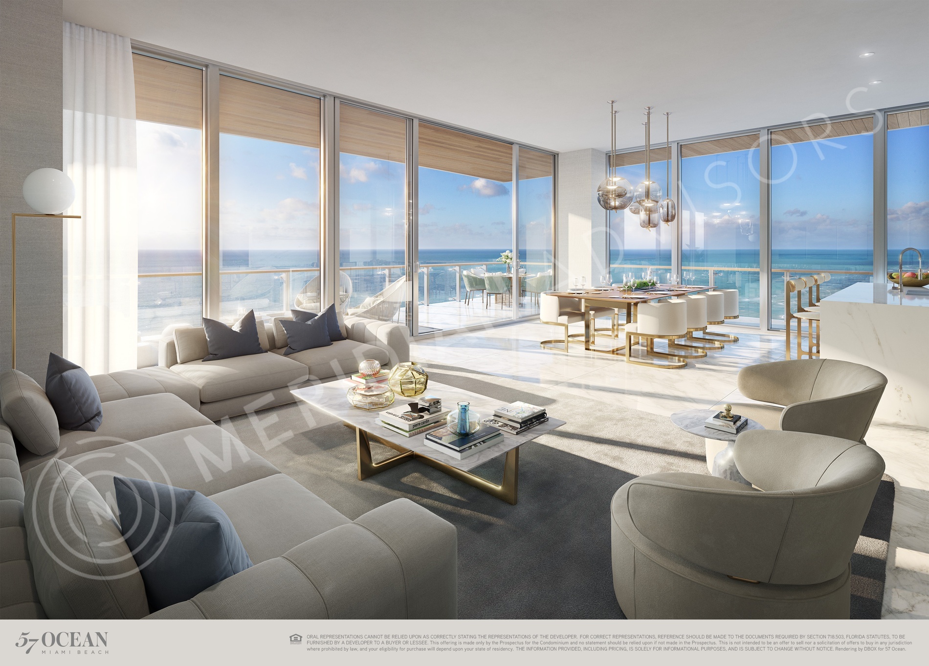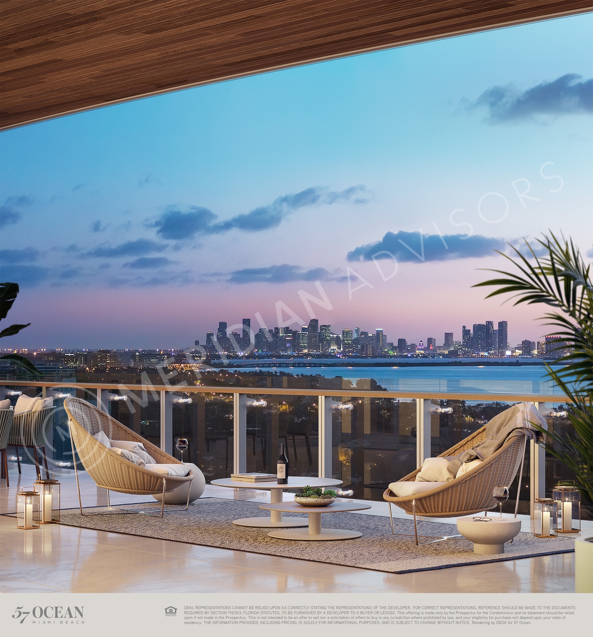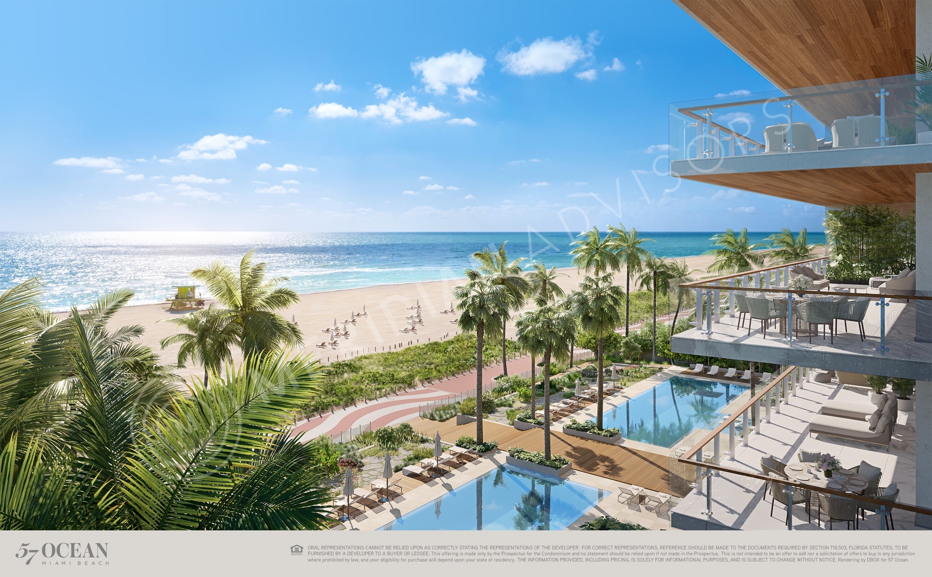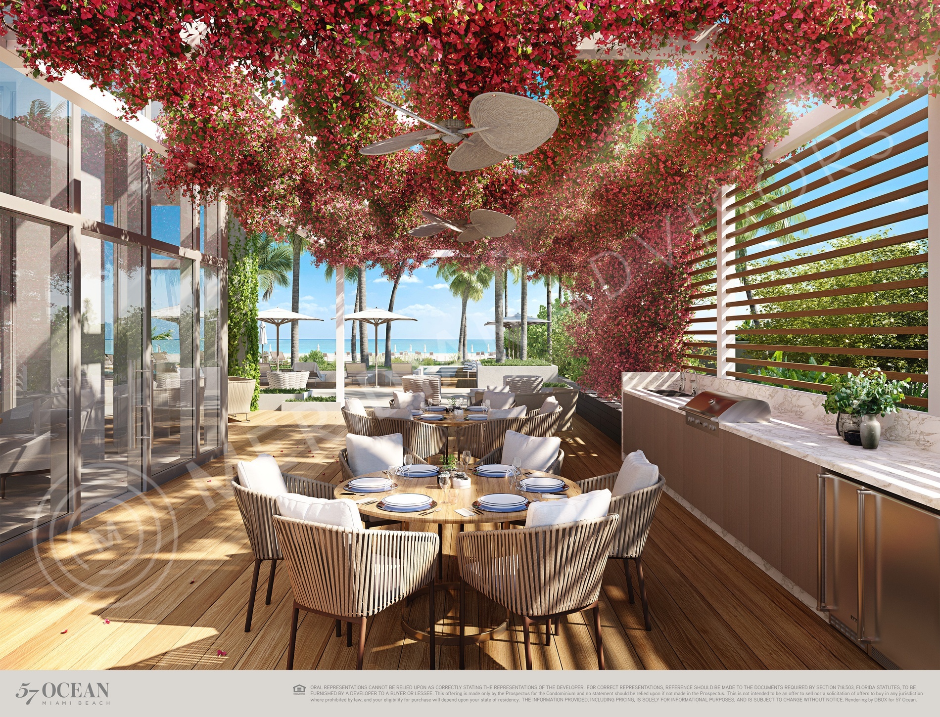 From the moment you step inside 57 Ocean, you’ll be greeted by a grand flow-through lobby with natural stone sun-drenched by the oceanfront vistas. Each residence within this community comes with excellently appointed upgrades, such as solid Carrara marble countertops, sumptuous primary suites featuring Poliform bathrooms, 10-foot floor-to-ceiling impact glass stacking doors, and tropical modern-inspired interior design. To take full advantage of Miami Beach’s alfresco lifestyle, all units are crowned with 12-foot deep terraces apropos, which spotlight wood-like ceiling accents and unrivaled waterfront panoramas. An outdoor living room adjacent to the sands of Miami Beach? Yes, please!