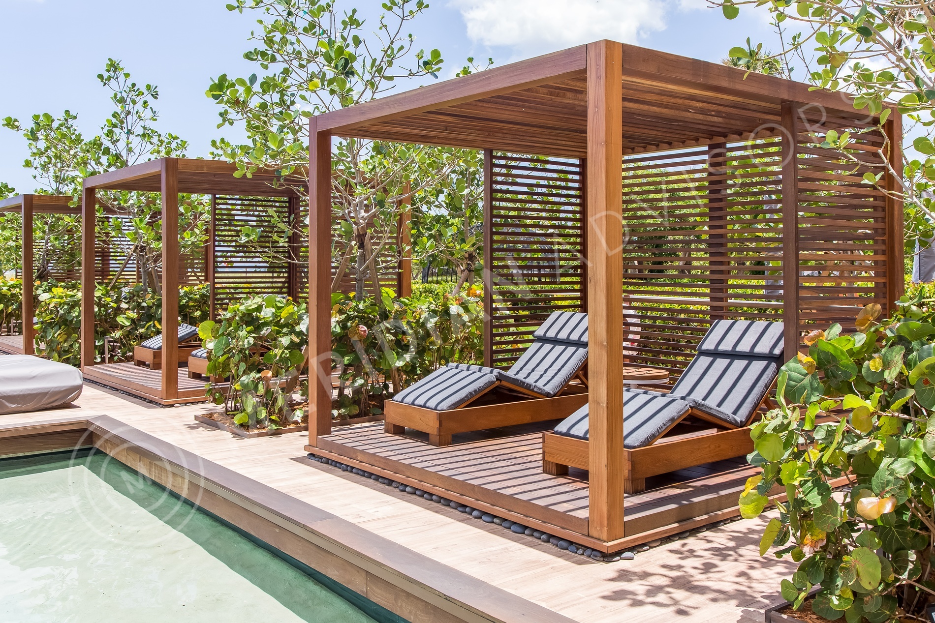 - Ponds of water overlooking the ocean surrounded by tropical gardens